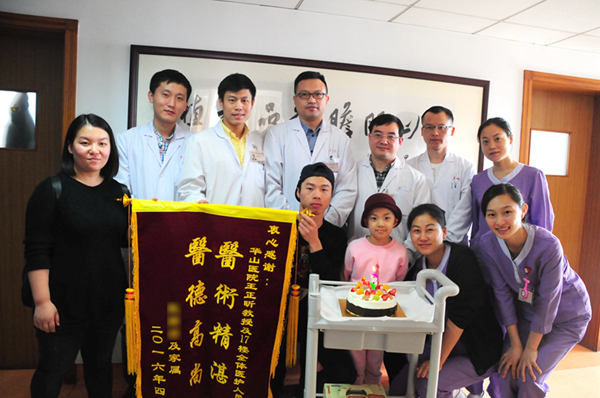 4月11日上午,即将出院的婷婷姑娘收到了一份来自17病房医务人员的特殊礼物:一个庆祝她8岁生日的蛋糕。看着女儿蹦蹦跳跳的样子,回忆起一步步挑战“不可能”的过程,开朗乐观的婷婷妈妈留着眼泪说,“孩子这一路生病,每次‘过关’,我就想,虽然我是她妈妈,把她带到这个世界上,但她生病了,真正救她的,却是她的医生们”。为此,出院前,妈妈连夜手写了2页长长的感谢信,并送来了“医术精湛、医德高尚”的锦旗。“千言万语表达不了感谢,你们伸出援手,给了她第二次生命。”妈妈在感谢信中写。