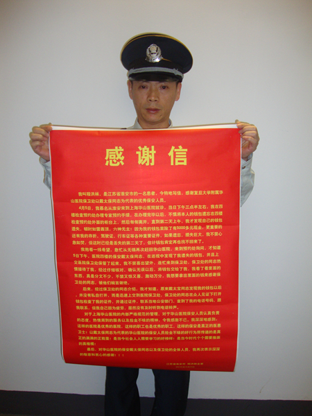 4月6日下午,当华山医院保卫处工作人员核实无误,将钱包交还失主程先生时,笼罩在程先生脸上的愁云终于散尽,露出轻松的微笑。程先生检查钱包内物品无缺失后,执意要把酬金送给捡到钱包的门诊保安戴太宝,被婉拒了。戴太宝说:“来院就诊的病人丢了这么重要的东西,肯定很着急,现在终于物归原主,我悬着的心也总算放下了。”