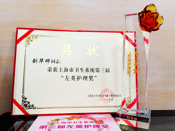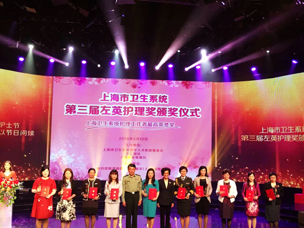 5月12日,是第104个国际护士节,第三届“左英护理奖”在上海教育电视台举行颁奖典礼。华山医院门急诊科护士长、主管护师刘华晔荣获“左英护理奖”,从市人大常委会钟燕群副主任手中接过荣誉证书和奖杯。华山医院党委顾小萍书记、护理部蒋红主任一同到场,见证了颁奖盛典。