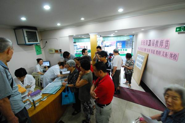 为迎接第30个教师节,8月30日一大早,来自静安寺街道的120名教师就来到我院体检中心,进行包括内科、外科、眼科、五官科、口腔科、妇科,以及肝肾功能、血糖血脂、肿瘤抗原等实验室检查的免费体检,体检中心的专家教授还放弃周六休息,为体检教师提供健康咨询服务。