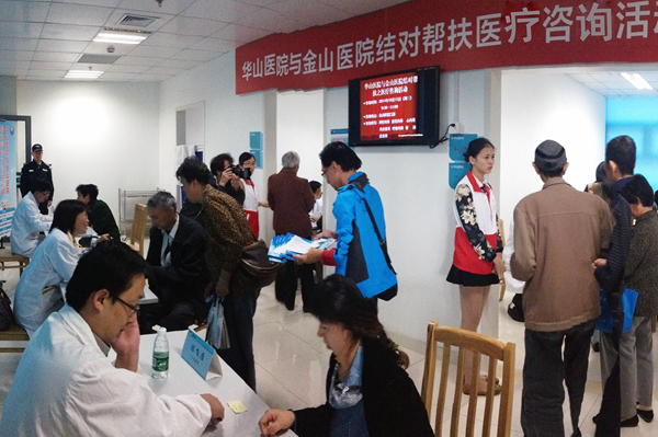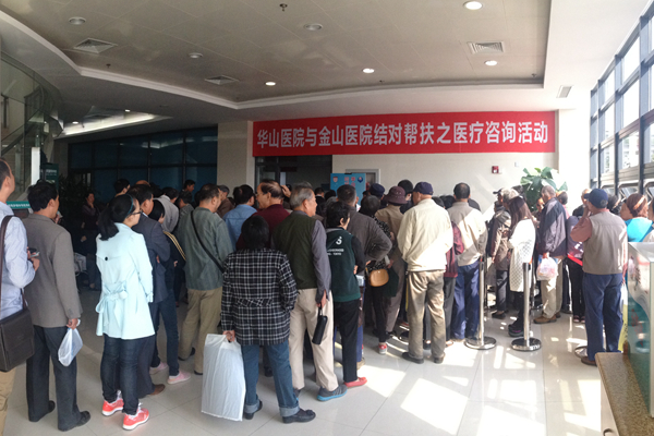 这是华山金山两院自2012年9月签约帮扶结对以来,两院党委组织开展的第5次医疗咨询活动。我院专家匆匆赶到金山医院时,慕名而来的金山居民已经排起了长队,居民们对华山医院每年三月和十月定期开展的医疗咨询活动十分熟悉,早就按需求领好了每个科室的预约号。吴波水、陈坚、陈飞雁等几位专家都参加过多次金山义诊,甫一到达就熟门熟路地走进了诊室,立刻进入了工作状态。另几位首次参加活动的专家也迅速适应了金山居民的方言。到中午,共有205名患者获得了华山专家提供的医疗咨询服务,另有92人次的患者得到了金山医院医护人员提供的免费健康体检,300余本健康宣教书籍更是让金山百姓满意而归。