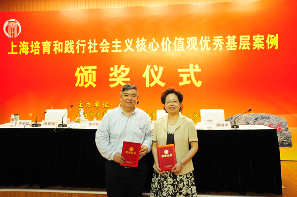 6月17日下午,在上海市委党校举办的“上海培育和践行社会主义核心价值观优秀基层案例”颁奖仪式上,华山医院党建项目《发出党员好声音,传递医院正能量》从120项案列中脱颖而出,获得十佳“最佳案例奖”,华山医院北院党建项目《党建引领公益,志愿凝聚力量》获得“入围案例奖”。华山医院党委书记顾小萍、华山北院党委常务副书记邹和建领奖。顾小萍书记作为最佳案例代表作交流发言,介绍了项目概况并分享了党建经验。