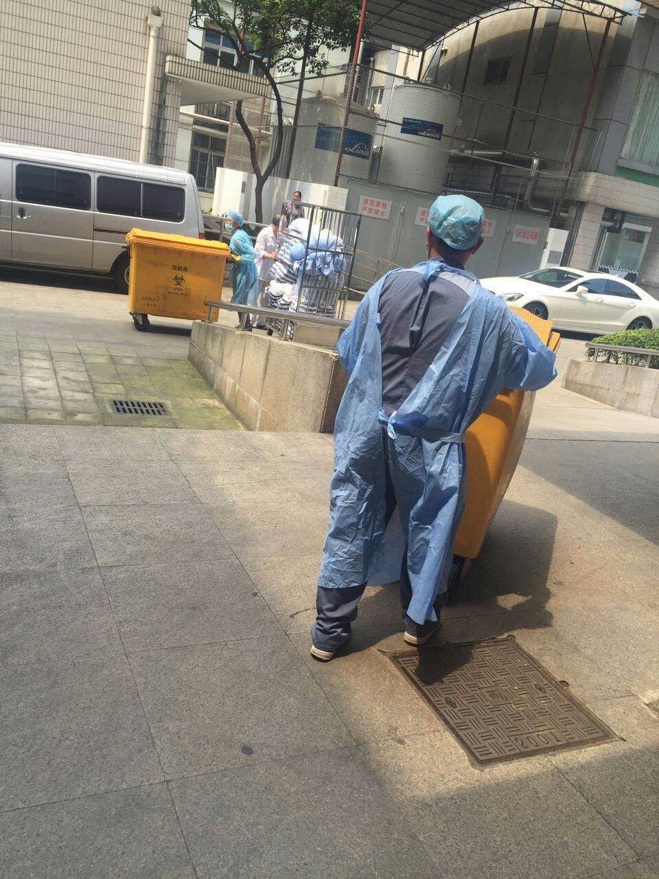 下午两三点,正是高温肆虐的时候,保洁人员、运送人员各司其职。垃圾清运人员把一箱箱的垃圾从病区、从门诊运到指定地点,站在“烘烤模式”垃圾房里清理及倒运。皮肤晒红晒黑了,汗水早已湿透工作服。辛劳不为别的,只因不忘自己服务的初心。