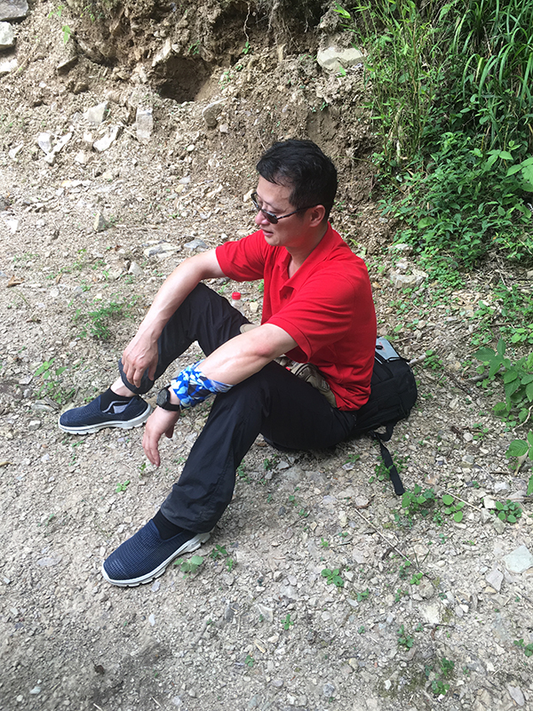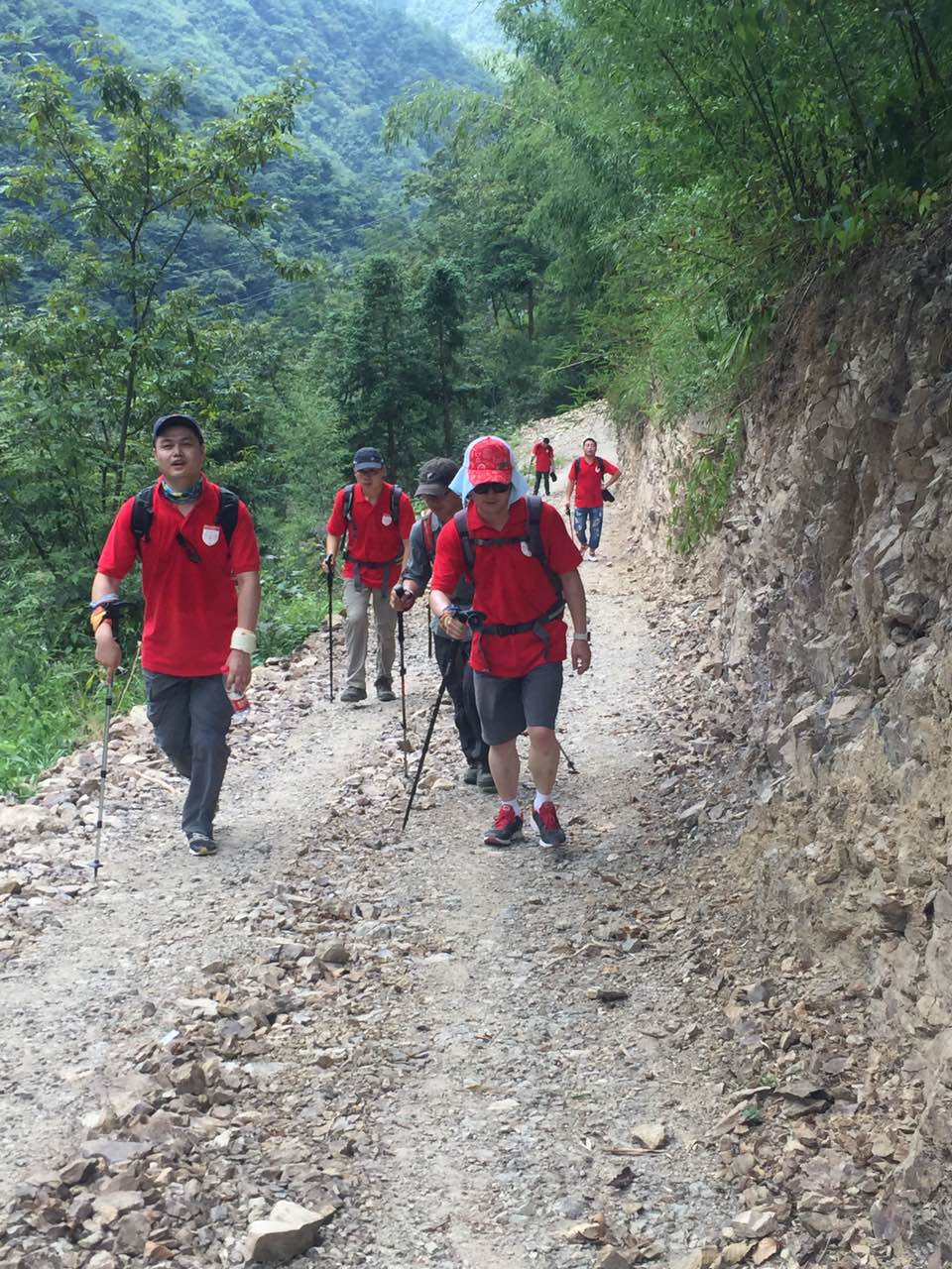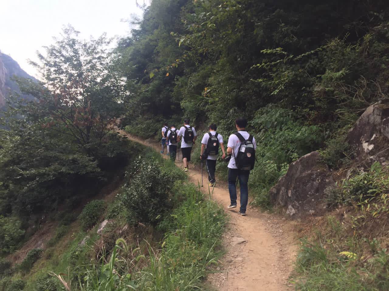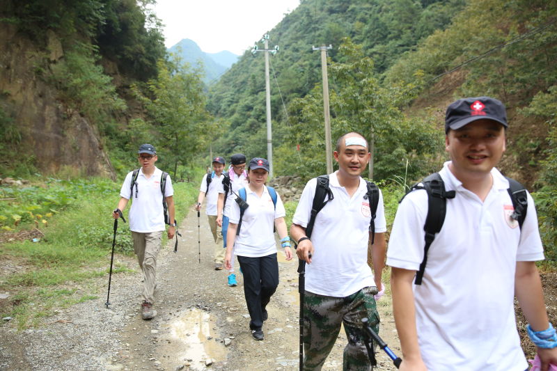 在当天晚上的团队合作训练和第二天一早的野外生存基本训练后,队员们冒着38℃的高温,身背辎重携型装备,在海拔1000多米的山路上,开始了20公里的徒步拉链。西起安徽省宣城市绩溪县伏岭镇,东至浙江省临安市马啸乡,北靠黄山,南依天目山的古道,山路高低起伏,路况变化多样,碎石路、泥土路、石阶路、陡坡路,甚至需要连续爬坡一个半小时,让队员们步步难行,耗尽体力。途中还遇暴雨,更是让坡陡坎深的山路变得泥泞艰险。队员们不畏艰难,团结协作,相互扶持,相互鼓励,突破生理极限,历时6小时成功穿越,在徽杭古道上印刻下了“召之即来,来之即战,战之能胜”的华山医学救援队精神。