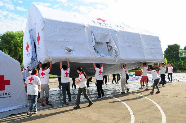 本次学习班将演练的核心目标聚焦在“装备”与“流程”。中国红十字总会为救援队配备的全新物资粉墨登场。在演练现场10名队员的努力下,47㎡网架式帐篷3分钟内即可快速展开。便捷性和牢固性的特点,使得网架式帐篷在很多灾区被广泛应用。此外,供水救援队利用全新配备的便携式制水设备,迅速将自然环境中的水源转化为生活使用水;临时避难场所搭建简易旱厕和洗浴场地,有效避免环境污染和保证大众卫生。经过整整一个下午的努力,全体队员凭借自己的双手,搭建完成了全新装备支持的红十字野战医院。