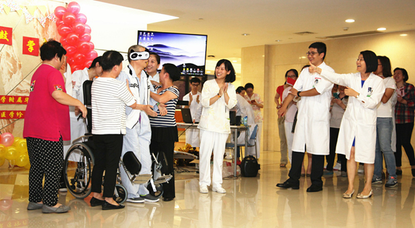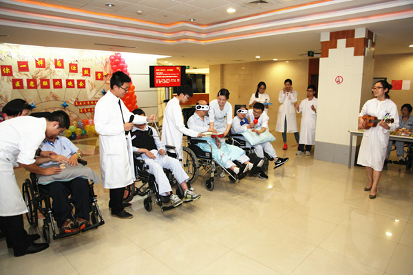 9月14日晚上5点半,华山东院80病区的门前张灯结彩,病人和医护人员快乐地围坐在一起。墙上那剪裁精美的大字“和你一样 为你鼓掌”,就是东院康复医学诊治中心今年中秋医患联欢会的主题。