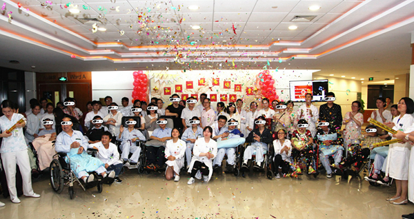 治疗师运用神经音乐疗法中的治疗式演奏,让几位患者运用他们现有的运动功能来击打乐器,在治疗师的提示下,作为不同声部加入,营造出了《茉莉花》美妙的效果,让大家耳目一新。最后在医护人员带来的一首《和你一样》中,圆满结束了这次联欢会,医患一起合影留念,定格了这美好的瞬间。