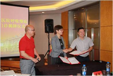 华山医院呼吸科主任李圣青教授主持揭牌仪式,华山医院医务处处长王惠英、世界健康基金会(Project Hope)高级项目经理徐健蓉先后做了热情洋溢的致词。随后王惠英处长、徐健蓉女士、中华医学会呼吸病学会副主任委员陈荣昌教授、周新教授和李圣青教授共同为慢性呼吸疾病门诊揭牌,华山医院呼吸科与杭州百世枷科技公司签订了呼吸慢病管理平台的合作开发协议。