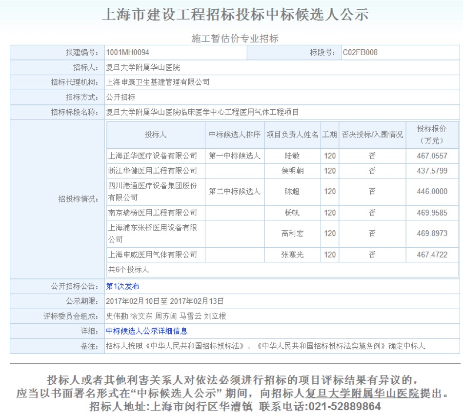 复旦大学附属华山医院临床医学中心工程(桩基工程除外)医用气体工程中标公示