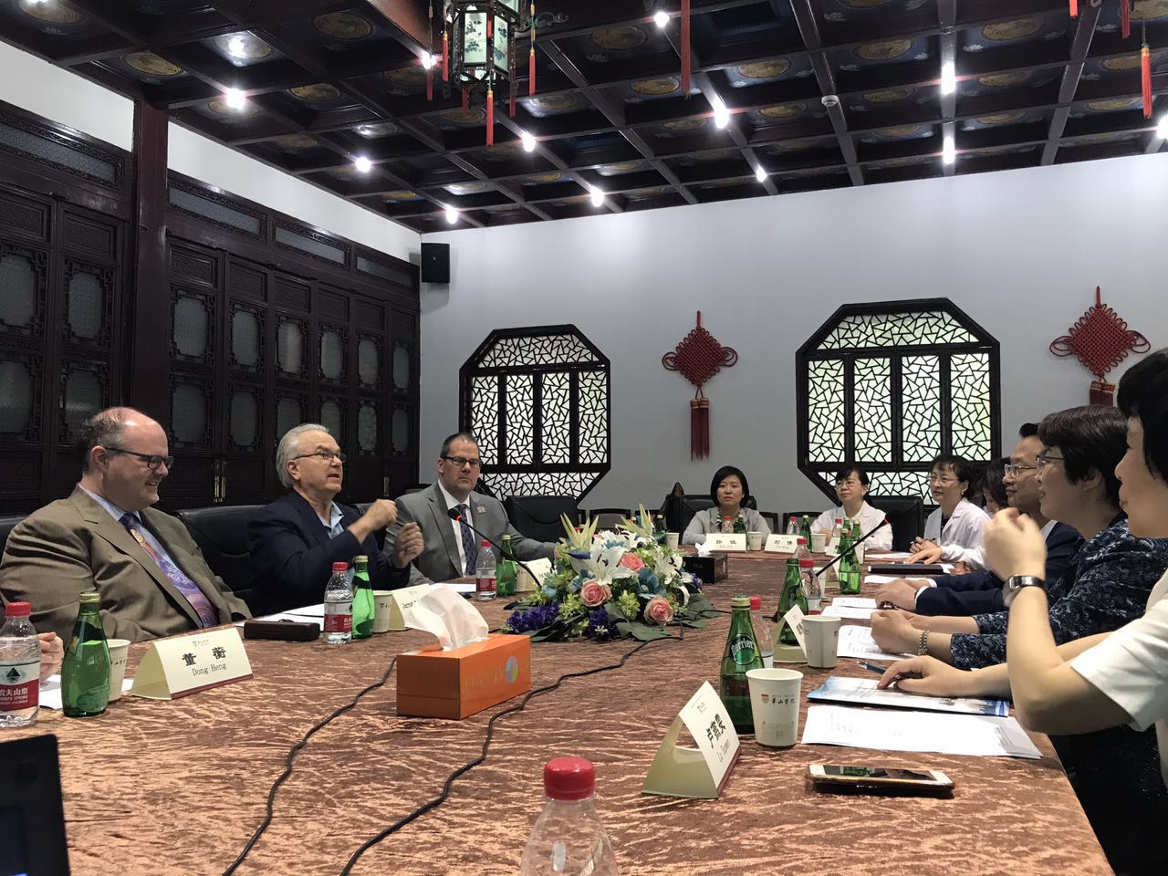 Sawyer医生以及他们的夫人。愉快的会谈在花园大厅举行,国际医疗中心顾静文主任主持,马昕副院长率院办、医务处、人事处、教育处、护理部、团委等多部门人员以及曾经去过凯特琳、今年即将去学习的多名医务人员一起,与美国客人进行了面对面的交流。