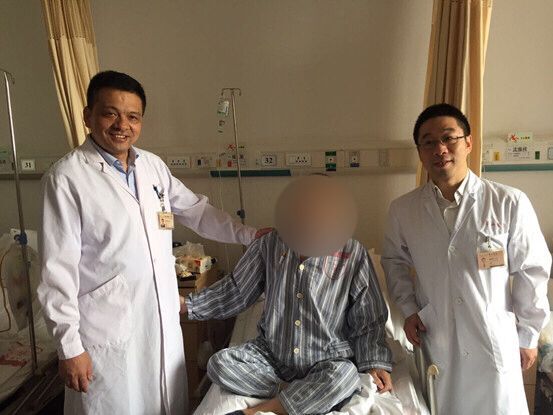 术后的老杨高兴地与两位主刀合影(左一钦伦秀教授,右一姜昊文教授)