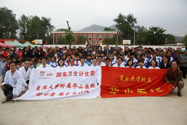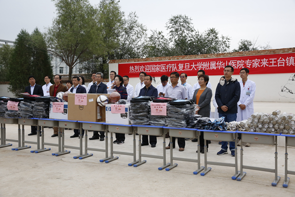 与义诊活动同时进行的还有贫困小学爱心捐赠工作和困难家庭帮困送医工作。9月13日,顾小萍书记、高继明纪委副书记、党办王晋伦主任等领导和医疗队员们带着华山医院党员们捐助的爱心善款和用善款购置的物资,来到了王台镇塔坪小学。塔坪小学建校于1910年,已经有超过100年的历史,在艰苦的条件下仍为农村的教育事业作出了重要的贡献。根据该校的实际情况和建设特色学校的目标,华山医疗队在新学期开学之际,为孩子们送上一份惊喜:为90名学生每人赠送一个书包,包括水彩笔、铅笔、水杯和新华字典等文具用品;为改善学校的教学设备,购买了2台戴尔电脑一体机、2台惠普打印机;还捐赠了少量篮球、足球、排球和跳绳等体育用品。顾书记在捐赠仪式上表示,这是华山人为农村教育事业尽绵薄之力的一份心意,衷心希望学校能够培养出更多优秀人才,建设好美丽、现代化的新永靖县。塔坪小学学生代表在发言中恳切地表示,同学们虽然家庭条件不好,但是都热爱学习,对未来充满憧憬,同学们承诺要用优异的学习成绩来回报华山医院叔叔阿姨们的支持和培养。捐赠仪式后,顾书记等一行又在甘肃省卫计委王晓明副主任、临夏州卫计委金有录主任的陪同下,马不停蹄地赶往3户精准扶贫户家庭,送医送药、捐赠善款、开展慰问。