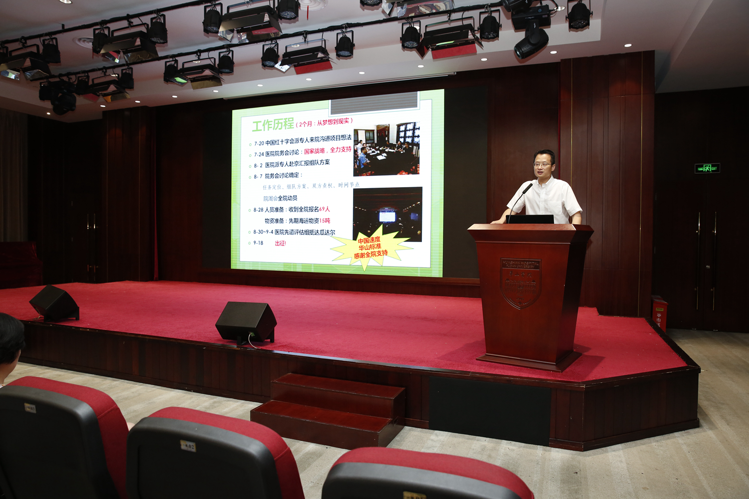 马昕副院长介绍了医院瓜达尔港医疗建设的准备工作。自承接瓜达尔港医疗服务建设任务后,不敢有丝毫怠慢松懈,全院部署、各科室配合、全体华山人积极参与。早在7月20日就着手部署瓜达尔港医疗服务建设项目,按照院务会确定的“任务定位、组队方案、双方责权”的原则动员全院人员参与,调动全院科室进行物资准备。最终,全院收到各科室踊跃报名69人,先期准备海运物资15吨,其中,药品132种,共10吨;耗材140种,共4吨;生活及办公用品71种,共1吨。8月30日到9月4日,医院派遣2名临床医务人员、1名红十字会人员组成医院先遣评估组抵达瓜达尔进行实地考察,调研基建部署、病种分布等内容。