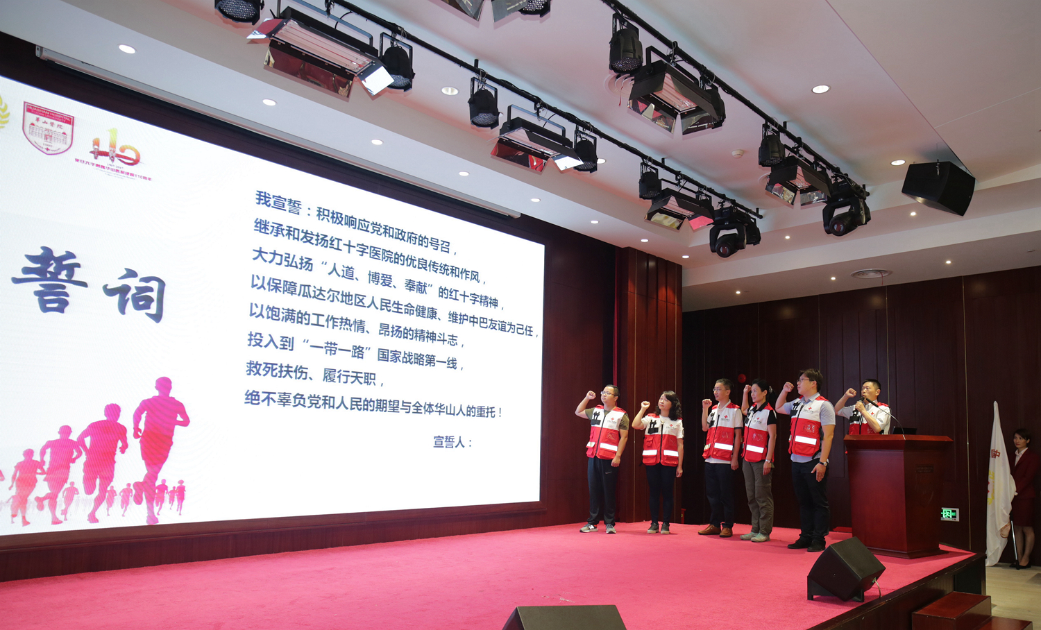 从69名报名者中挑选的这第一批6名队员,有的经历汶川地震救援,有的经历菲律宾台风、尼泊尔地震海外救援,意志坚定,经验丰富。在领队吴钢副教授的带领下,队员们庄严宣誓:积极响应党和政府的号召,继承和发扬红十字医院的优良传统和作风,大力弘扬“人道、博爱、奉献”的红十字精神,以保障瓜达尔地区人民生命健康、维护中巴友谊为己任,以饱满的工作热情、昂扬的精神斗志,投入到“一带一路”国家战略第一线,救死扶伤,履行天职,绝不辜负党和人民的期望与全体华山人的重托!丁强院长、顾小萍书记分别为医疗队授旗、授牌,并预祝6名勇士凯旋。