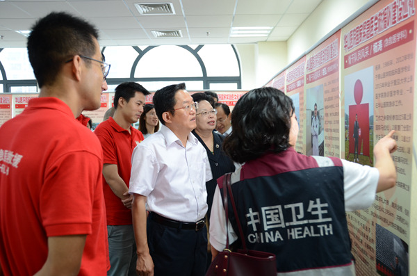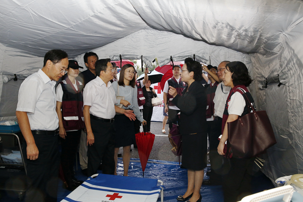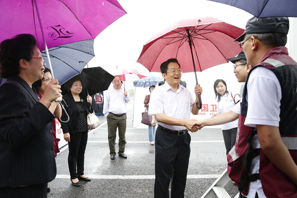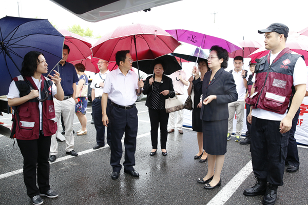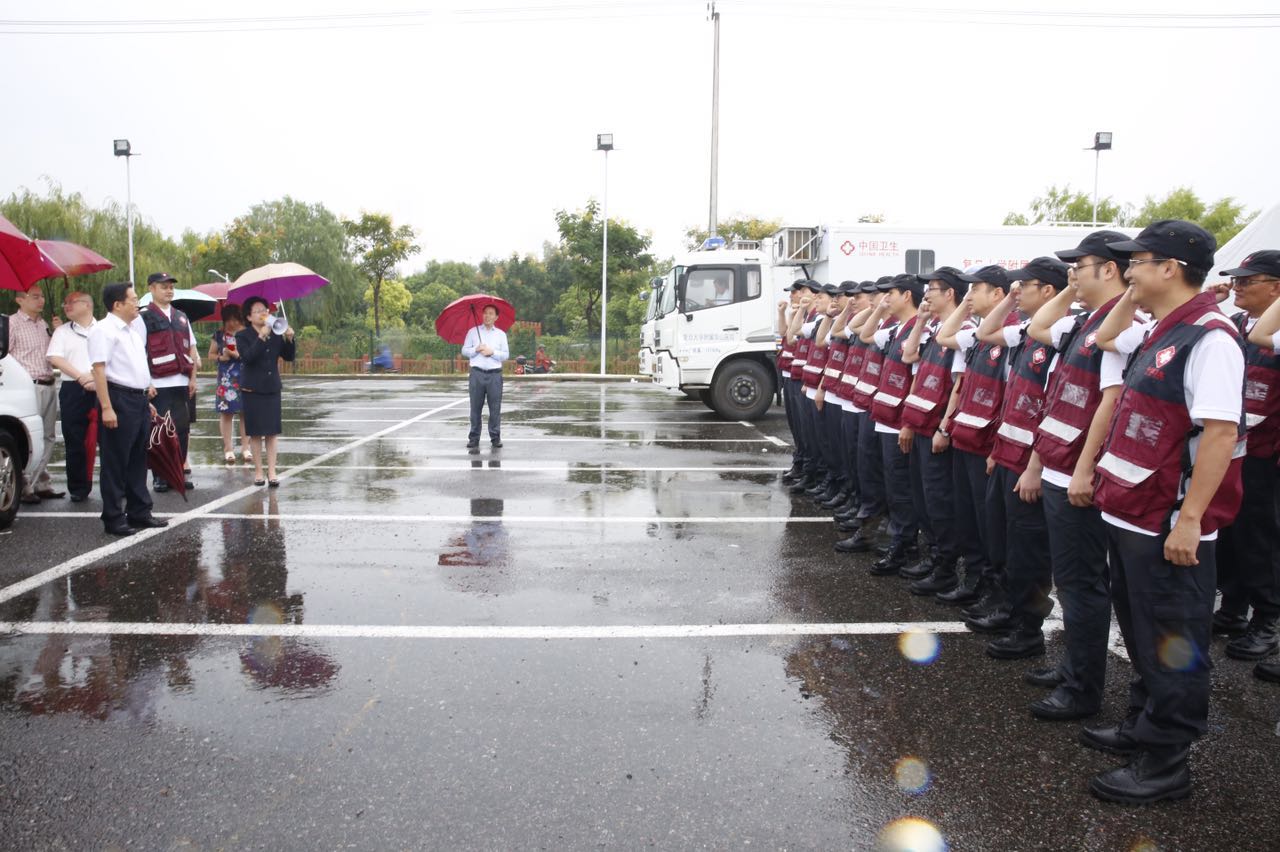 9月20日早晨,上海大雨滂沱,华山医院北院旁的顾村公园,华山医院国家紧急医学救援队员精神抖擞,整齐列队在救援车前等待检阅。9点,国家卫生计生委卫生应急办公室许树强主任、应急办指导处徐敏处长、中国疾病预防控制中心卫生应急中心李群主任、天津大学灾难医学研究院侯世科院长、军事医学科学院卫生装备研究所伍瑞昌研究员一行5位领导,在上海市卫计委应急办何智纯主任、华山医院党委顾小萍书记、邵建华副院长、耿道颖副书记、医务处王惠英处长等的陪同下,冒雨实地调研、督导了紧急医学救援队的建设情况。