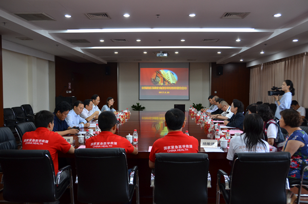 在北院会议室,许树强主任一行与院领导座谈,探讨医疗队建设方向。上海市卫计委副主任闻大翔介绍了上海市紧急医学救援队伍建设情况;王惠英处长汇报了华山紧急医学救援体系构建、队伍建设、装备配置、日常管理及近年国内外重大救援案例等情况;徐敏处长、李群主任、侯世科院长、伍瑞昌研究员分别从人员、装备、训练、预案等方面,就如何提升装备配置、优化稳定队伍结构、强化统一标识、提升自我保障能力等方面提出了具体、可操作的建议。