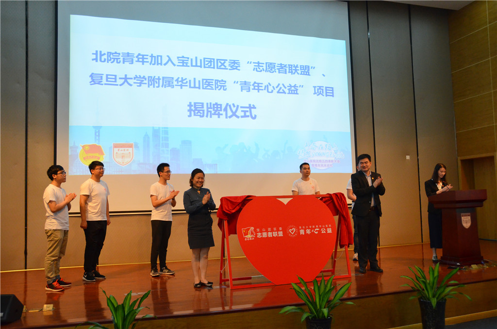 为积极响应上海市卫生计生系统创建文明行业,迎接首届中国国际进口博览会的召开,北院成立了青年志愿者团队,受宝山团区委领导邀请,北院青年志愿者队正式加入宝山区域化团建青年志愿服务联盟;此外,院团委还搭建了“青年心公益”这一全新平台。郁梦娴书记和张军书记共同为北院青年加入宝山区域化团建志愿服务联盟及华山青年心公益项目揭牌。