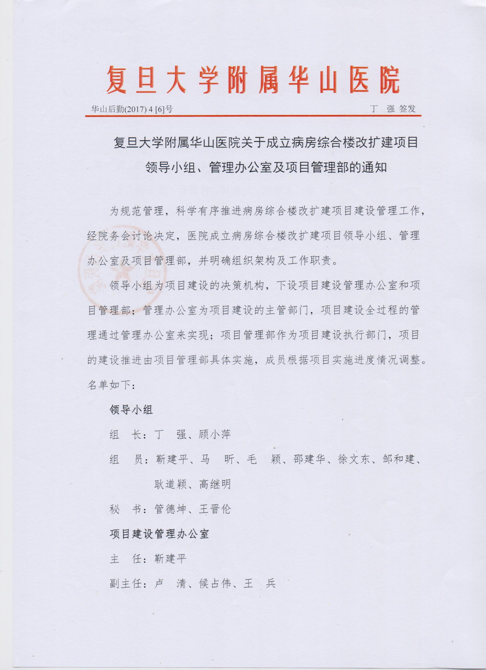 复旦大学附属华山医院关于成立病房综合楼改扩建项目领导小组、管理办公室及项目管理部的通知
